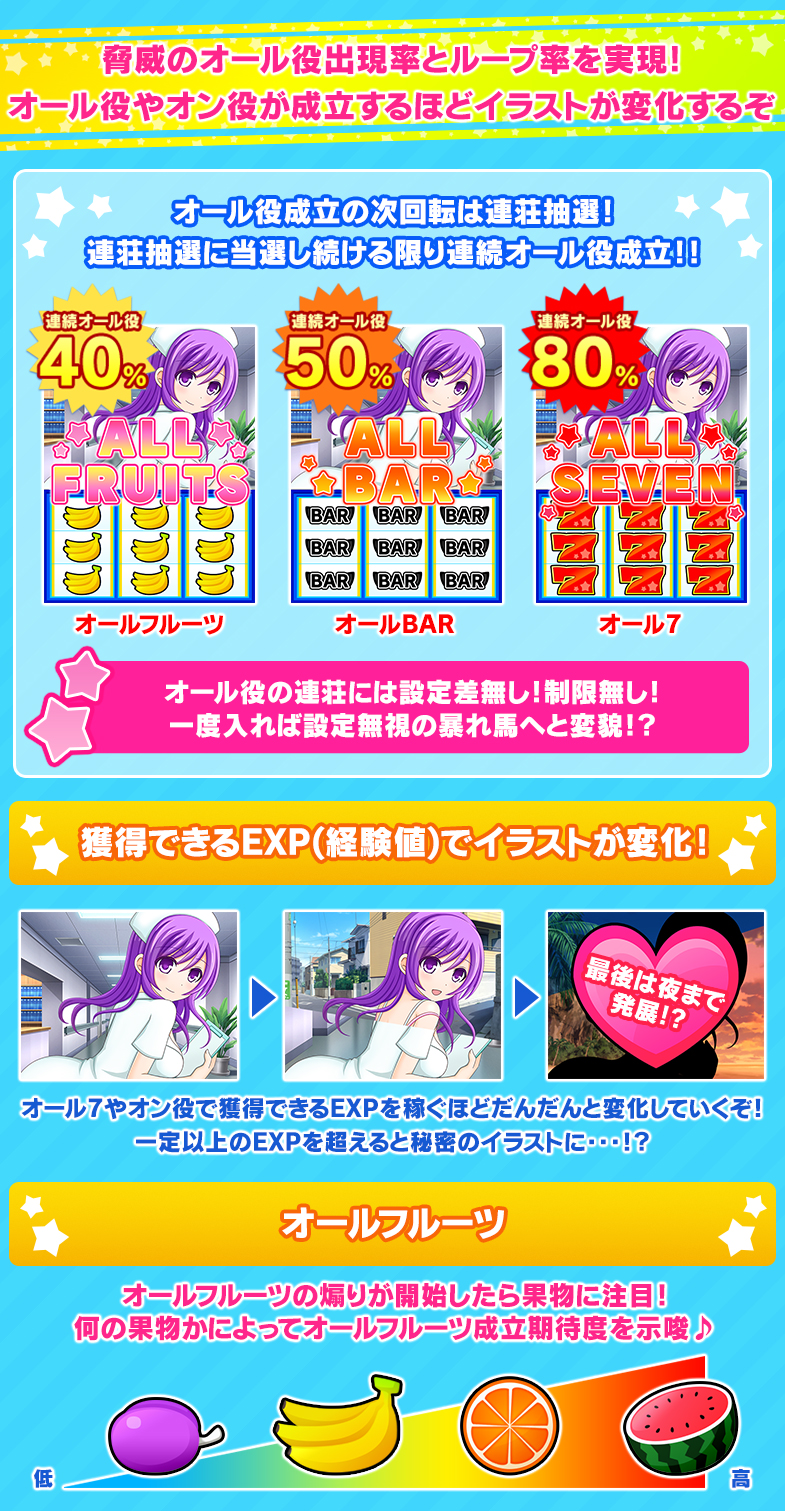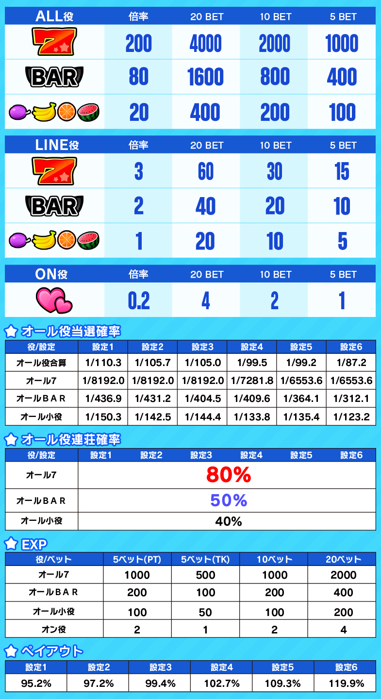 オール7などの役によりEXPが加算されます。 さらにポイントエリアでは毎ベット(Pt)分のEXPが加算されます。 -