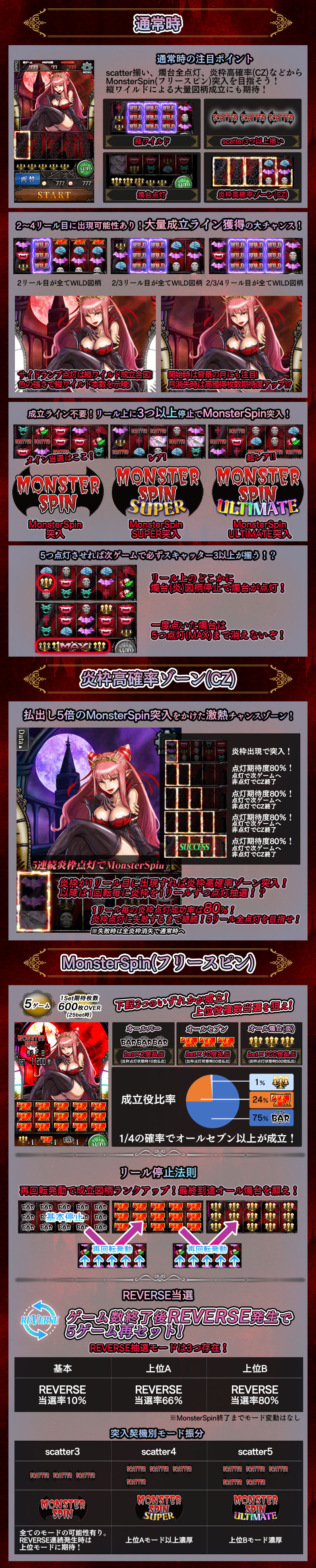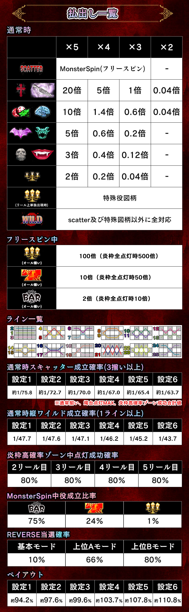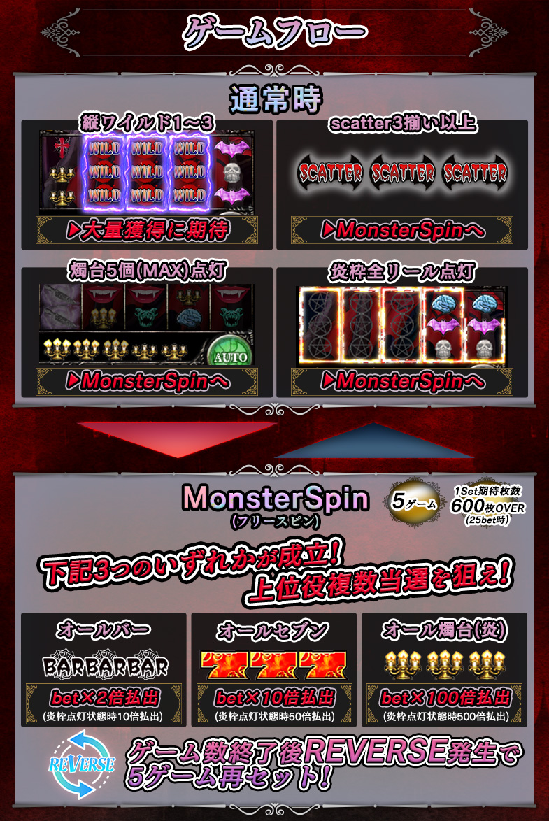 TheMonsters 5Reel -ヴァンパイア編-「5リールスロット」はMAXベット専用機です(25枚/50枚/100枚の3種類の台からお選び頂けます)。 -